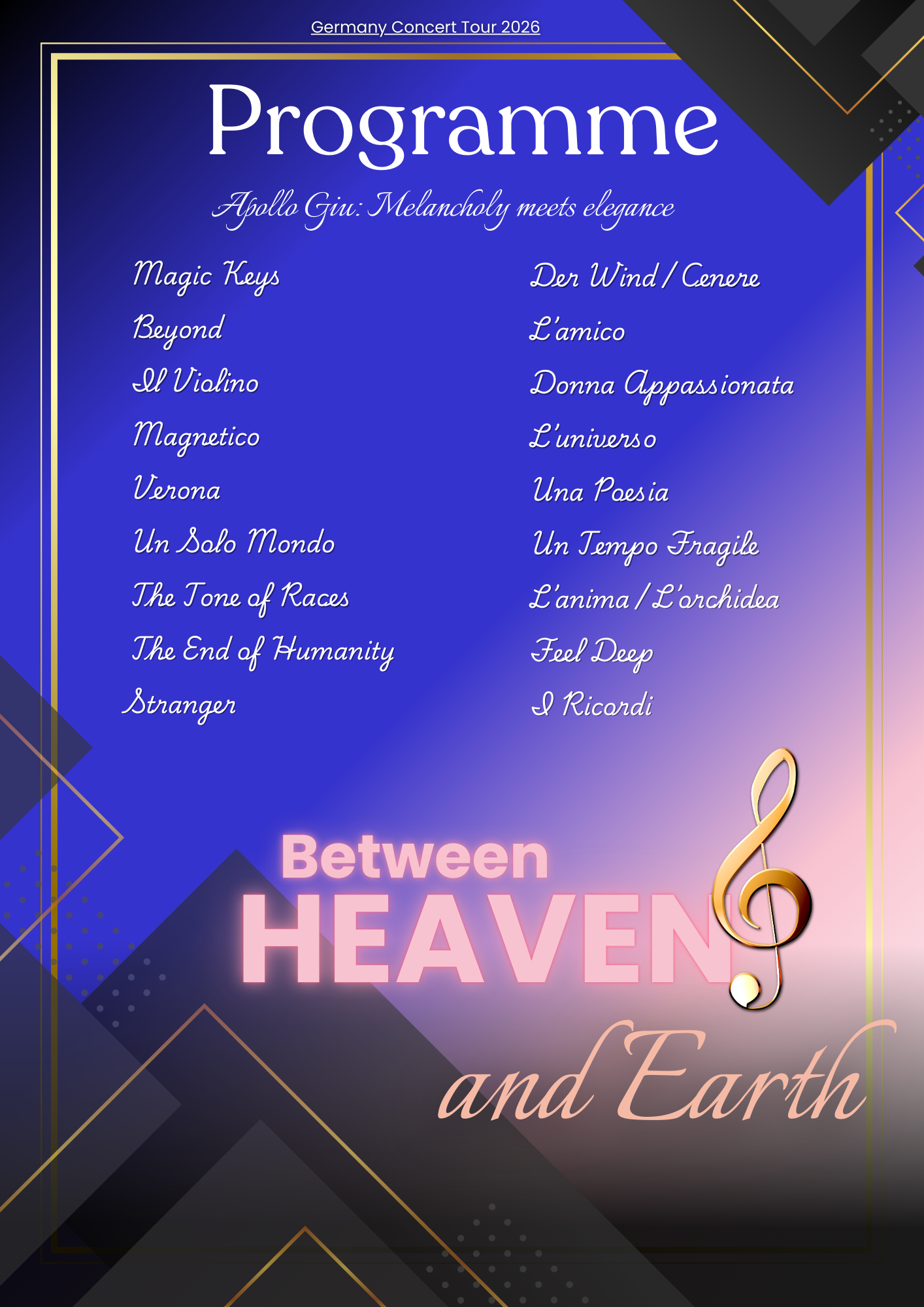 Piano and violin – an emotional interplay between two instruments. Composer Apollo Giu transports his audience into a world full of moving sounds – filled with passion, depth and refined elegance.