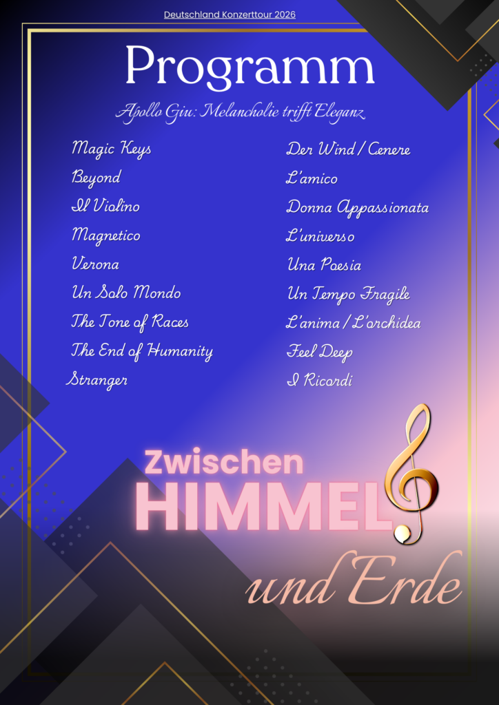 Klavier und Violine – ein emotionales Zusammenspiel zwischen zwei Instrumenten. Der Komponist Apollo Giu entführt sein Publikum in eine Welt voller berührender Klänge – hier klingen Leidenschaft, Tiefe und feine Eleganz.